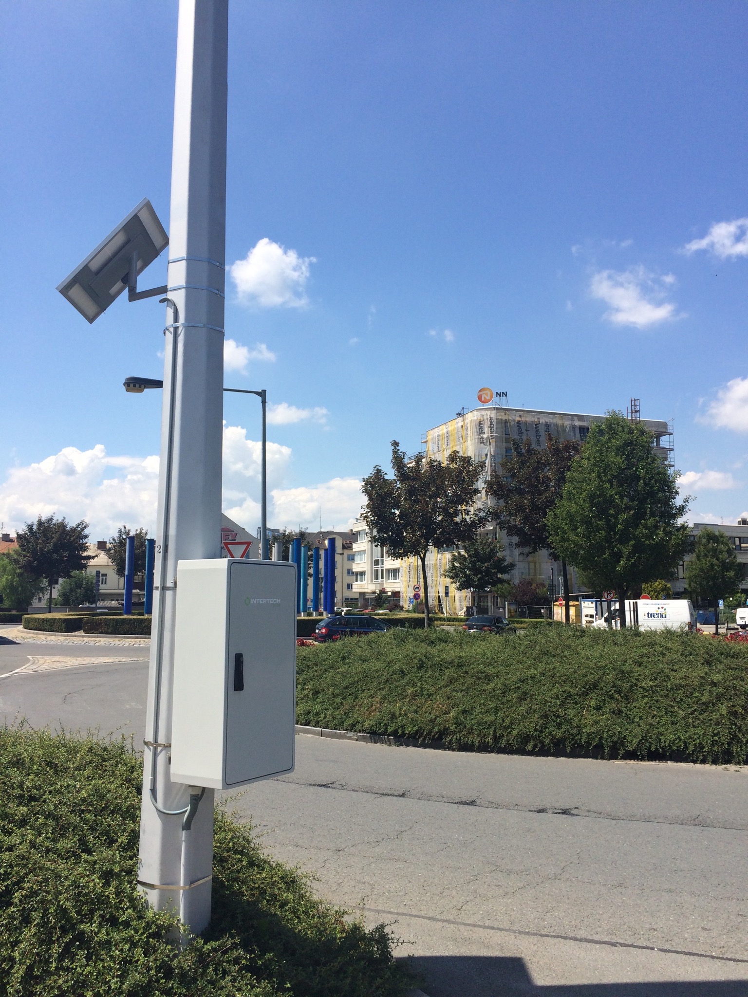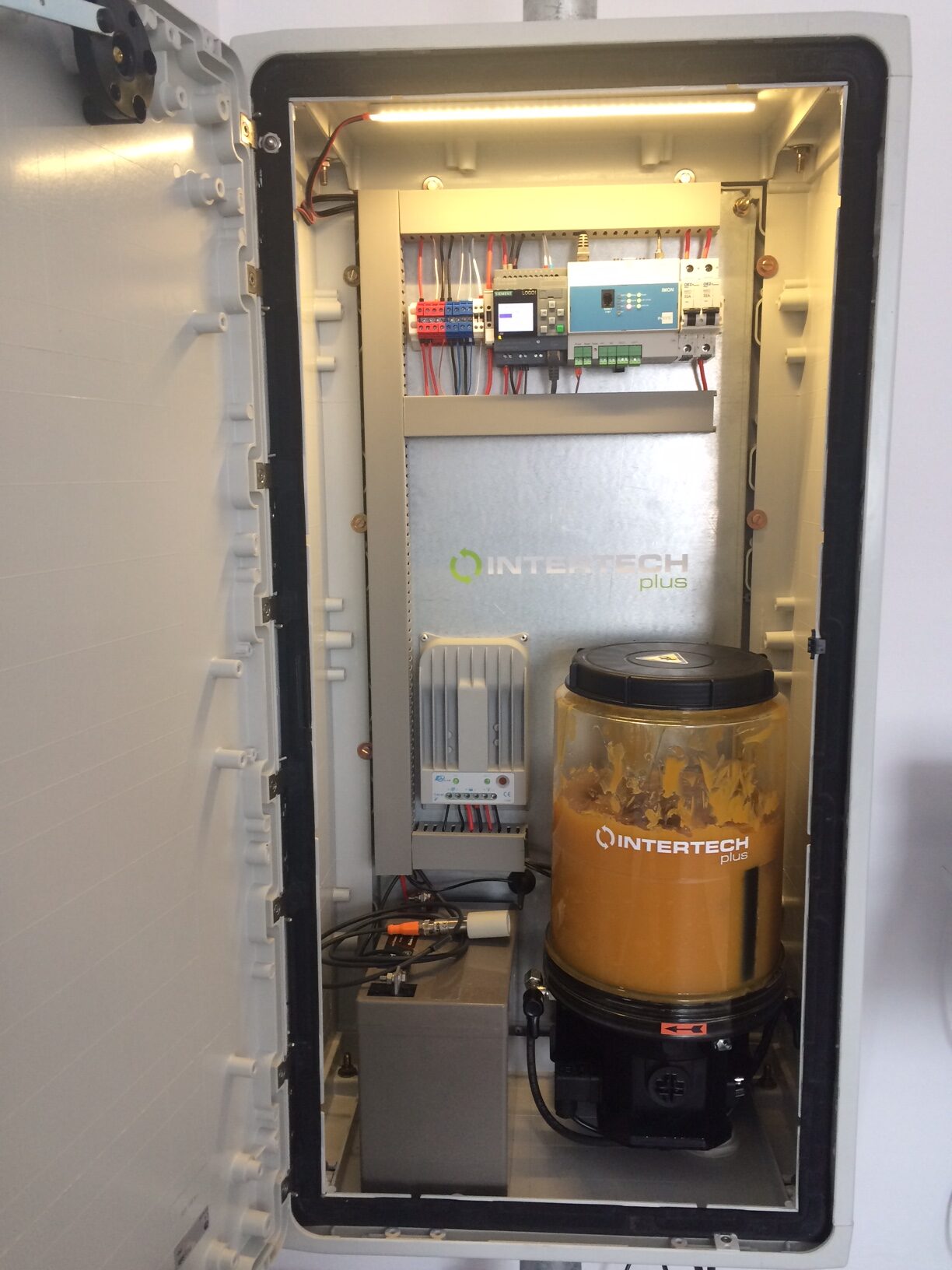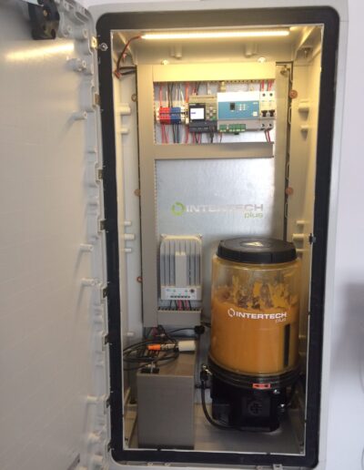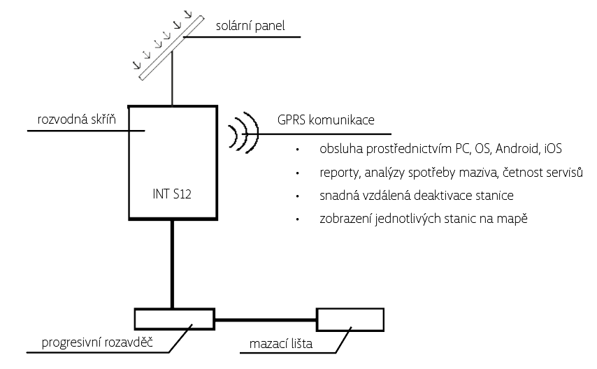 Fotovoltaické mazací zařízení INT S12 podle předem nastaveného časového cyklu aplikuje biologicky odbouratelné mazivo INTLUBE ECO na kolejnice. Celý systém je hlídaný speciálně vyvinutým softwarem s mapovým podkladem daného města prostřednictvím GPRS.