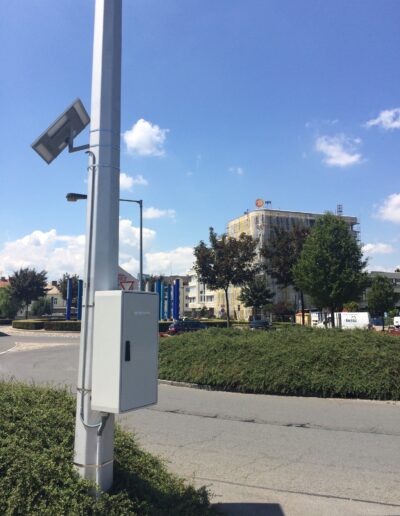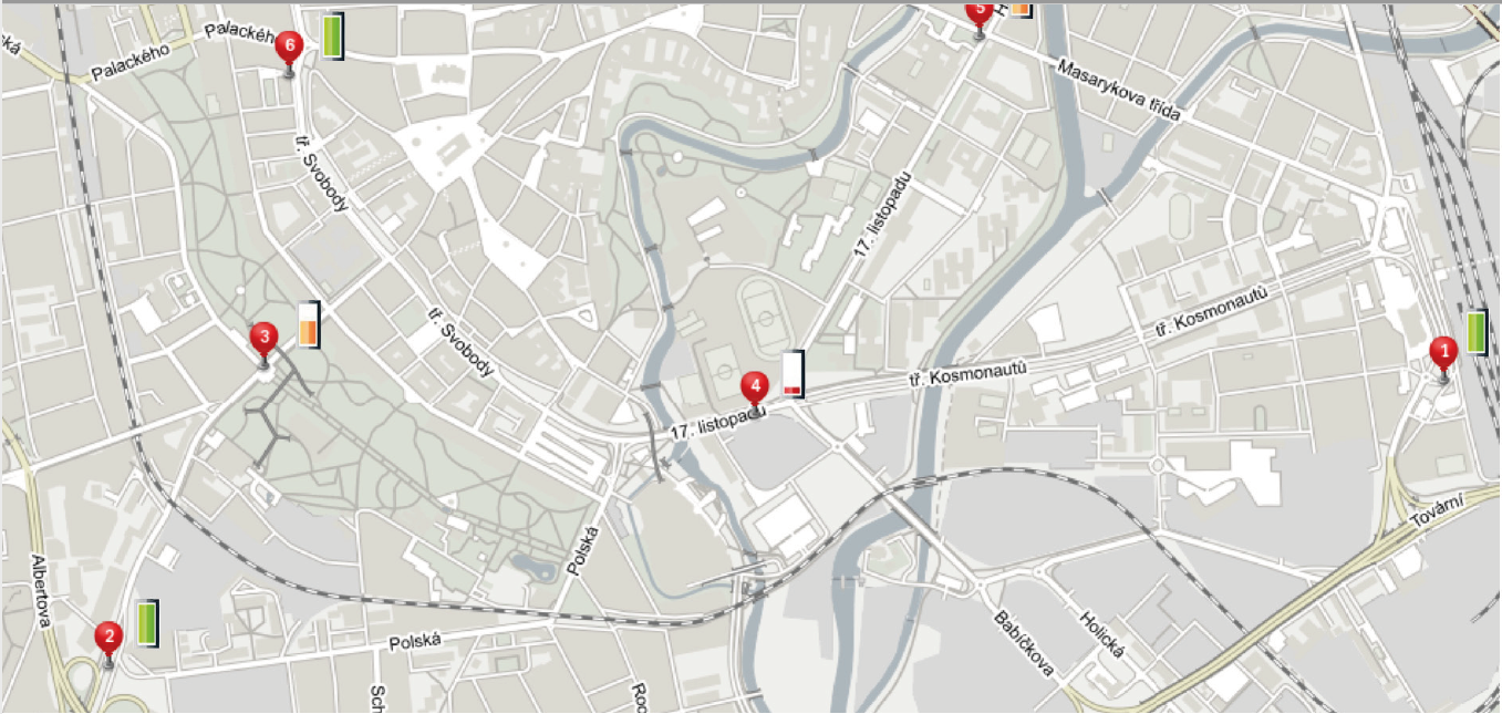 - Zobrazení jednotlivých stanic na mapě města s realtime monitoringem stavu případe výstrahou nutnosti servisu.